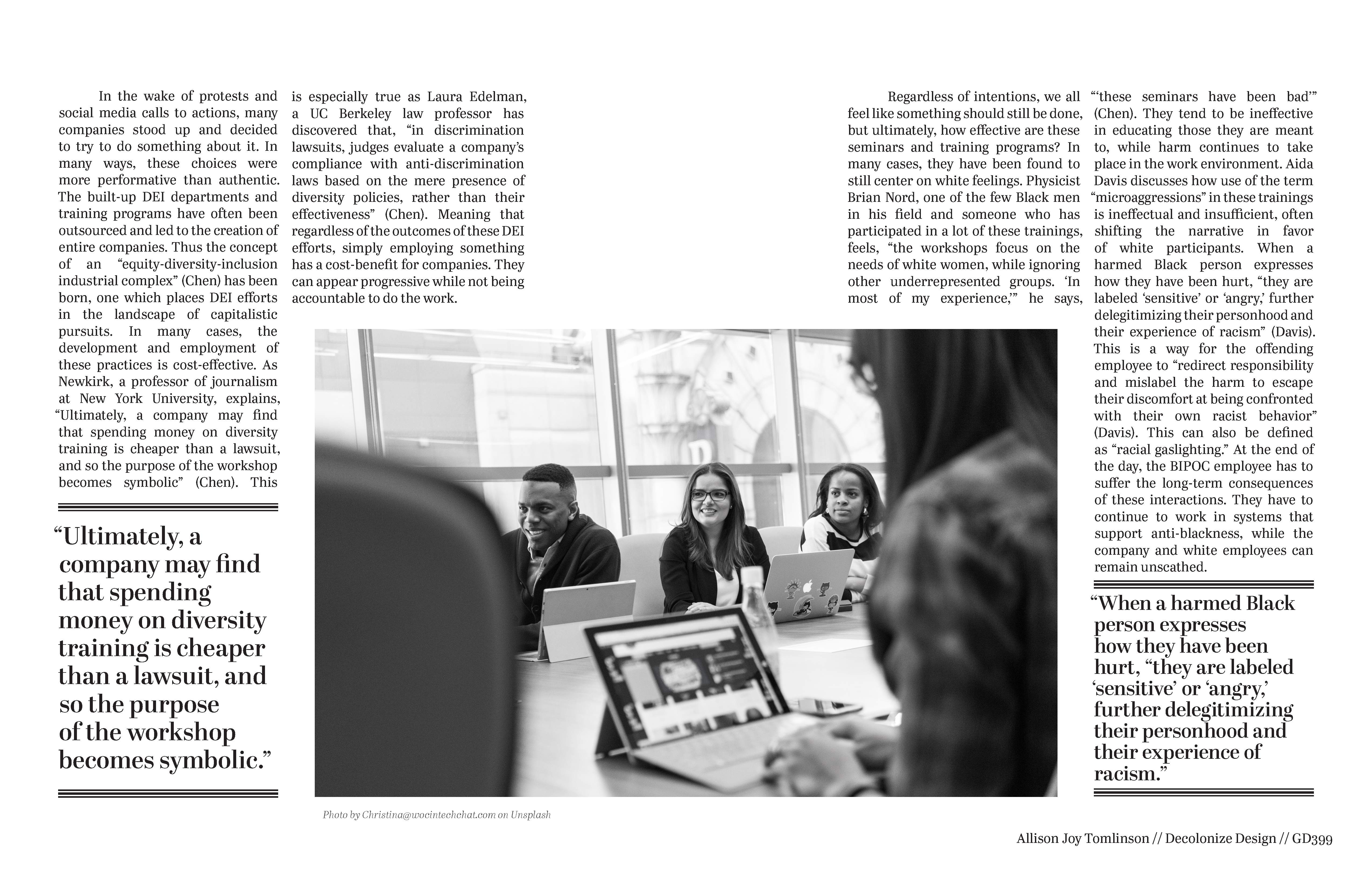 A graphic essay written for a Decolonize Design course, researched with a focus on how to unpack current Diversity, Equity, and Inclusion (DEI) practices and move towards a decolonized perspective.